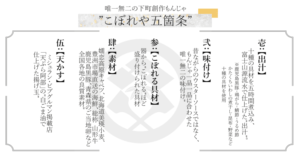 『こぼれや五箇条』は、創業以来「こぼれや」が大切にしてきた『唯一無二の下町創作もんじゃ』の哲学を言語化したものです。特に、出汁・味付け・盛り付け・素材・揚げ玉の五つのこだわりを原則としてまとめています。