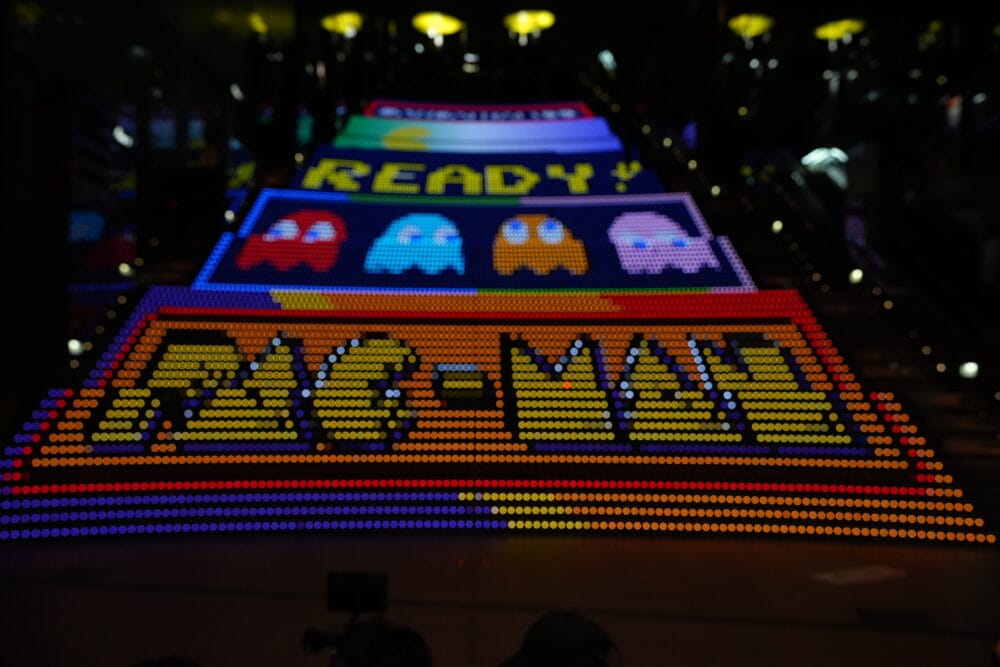 また、1980年に誕生したアーケードゲーム「PAC-MAN」が京都駅の大階段に登場する「PAC-MAN Sound Vision パクパク大階段」にも注目です。和傘や千社札など日本文化をモチーフにした映像空間を舞台に、PAC-MANとゴースト達が駆け巡るダイナミックな映像コンテンツとなっています。