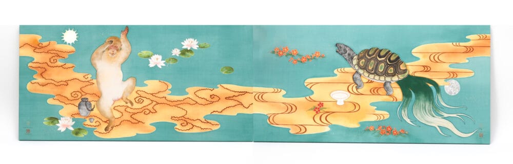 伝統染色技術と現代的なユーモアが融合した唯一無二のアートは、姉の永澤翔子氏が背景と花を手描友禅染の技法で染め出し、その上に妹の板垣夏樹氏が猿亀と酒を岩絵具で描画。共に金彩加工を施し完成させた一対の作品となっています。