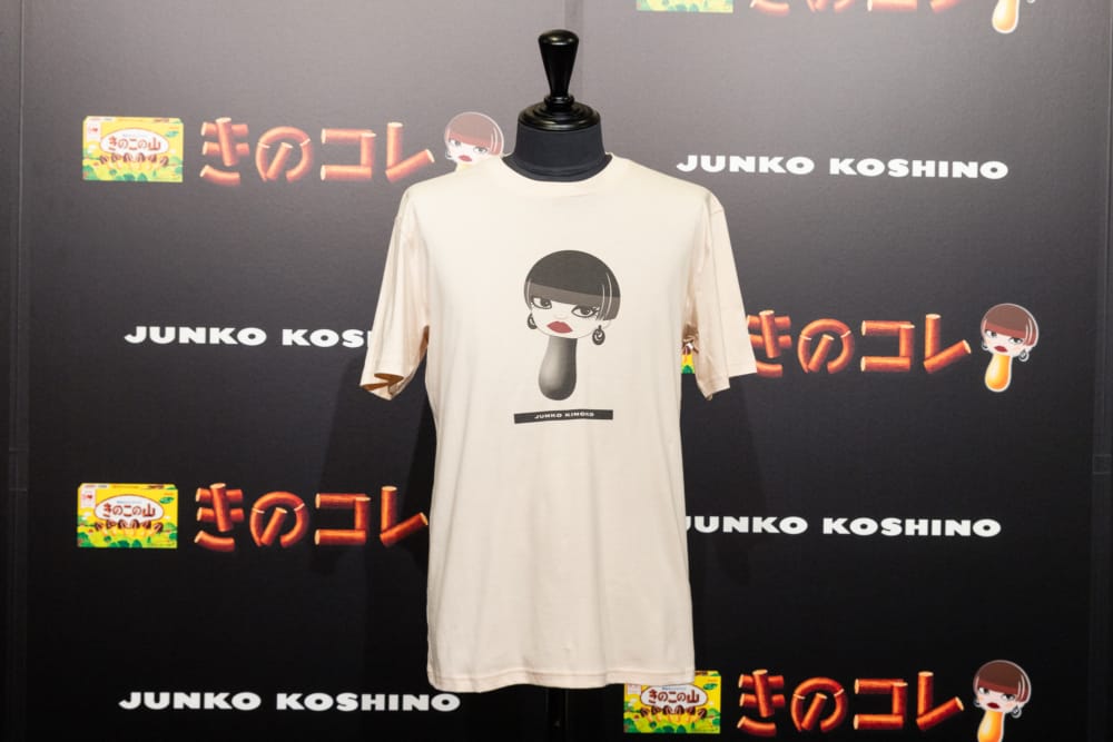 イベントの最後には、コラボレーション企画として、コシノ氏自身をモチーフにしたキャラクター「JUNKO KINOKO」がデザインされたオリジナルTシャツが、抽選で500名にプレゼントされるキャンペーンが発表されました。