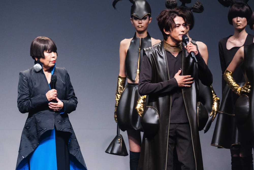 フィナーレでは、モデルたちとともにコシノ氏が颯爽と登場し、サプライズゲストとして「きのこの山50周年アンバサダー」の俳優、森崎ウィン氏がコシノ氏をエスコートしました 。