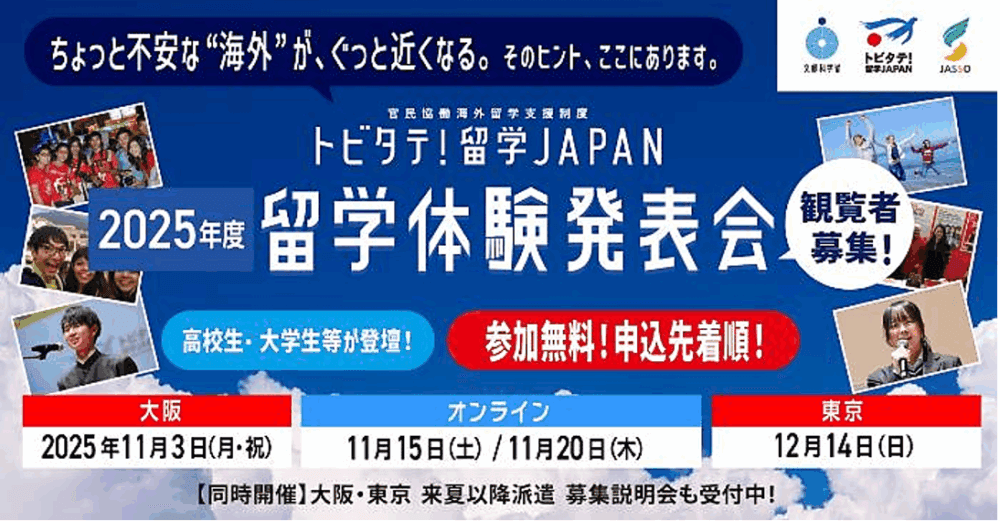 文部科学省及び(独)日本学生支援機構による留学促進キャンペーン「トビタテ!留学JAPAN」が、11月に大阪会場、オンライン形式、12月には東京会場で「留学体験発表会」を開催します。