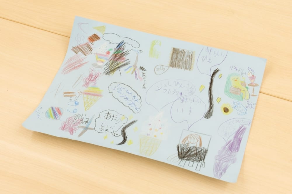 画用紙いっぱいに描かれたアイデアには、ぬいぐるみ、家の壁材、スマホカバー、ソファや枕、ベッド、食品サンプル、ゲーム機のカバー、縄跳び、仮装用のひげなど、子どもならではの独創的な案が並びました。
