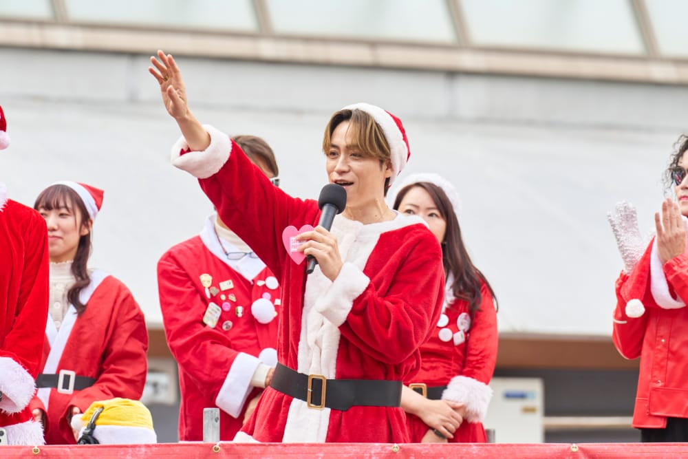 そして、EXILE TETSUYAさんも登壇。初参加となるTETSUYAさんは、「たくさんの笑顔とHAPPYを子どもたちに届けられるよう、全力サンタとして盛り上げていきたい」とコメント。参加者へ大きく手を振りながら声をかけ、熱気を高めました。