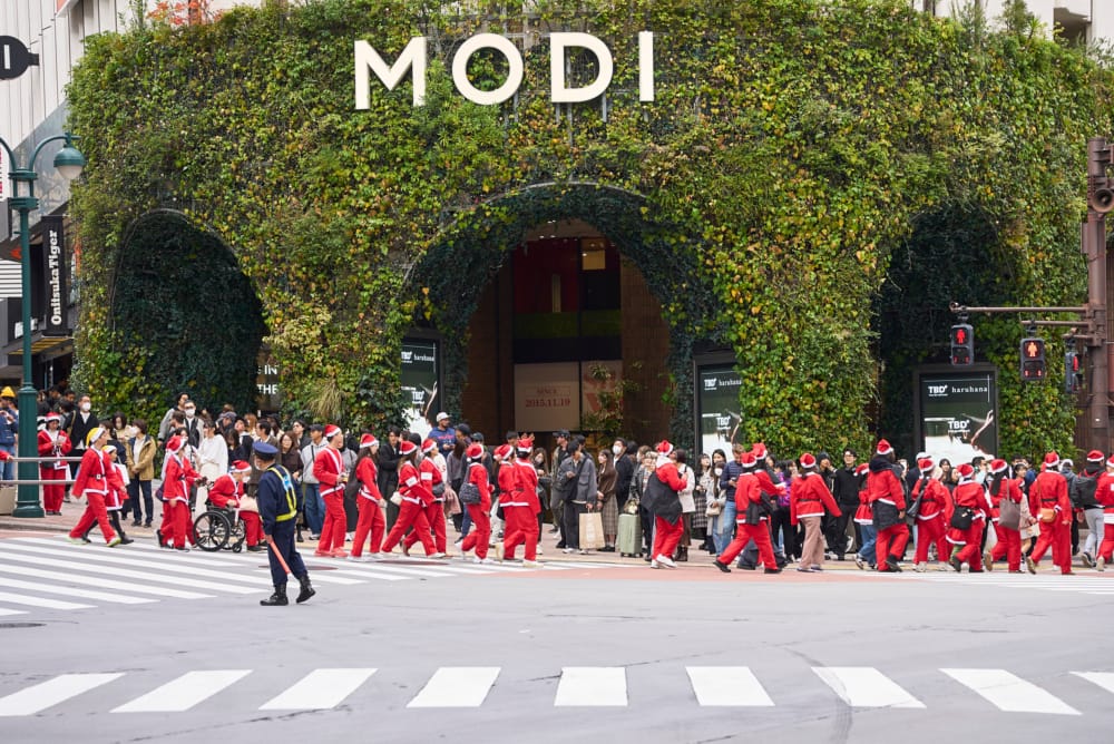 そして、約2,600名のサンタクロースのパレードが代々木公園からスタート。グループごとに分かれて、ケヤキ並木を抜け、神宮前交差点、渋谷MODI前へとゆっくり歩いていきます。