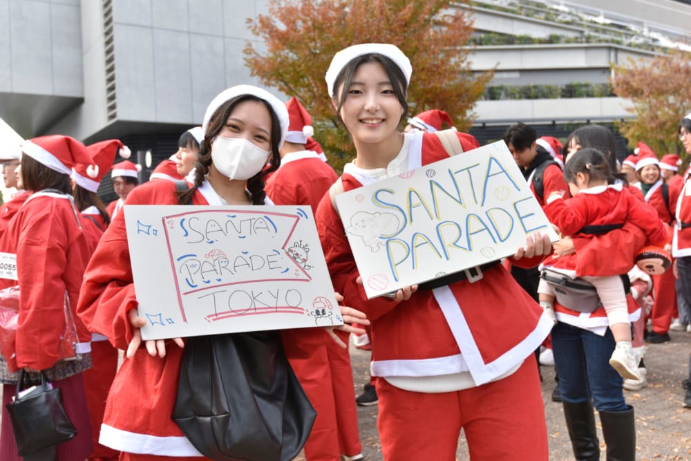 また、メッセージボードを掲げて歩く人もいて、「サンタになって子どもたちをおうえんしよう!」「TOKYO SANTA PARADE きみもサンタになれるよ!!」といった言葉が沿道の人々にも届き、やさしさが広がっていく瞬間が見られました。