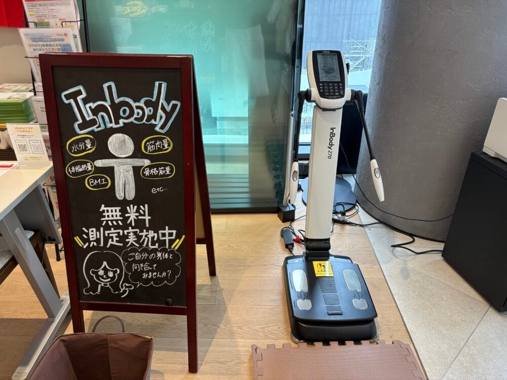 例えば、この店舗の目玉的存在・体成分分析装置「InBody」。この機械の上に素足で乗るだけで、体水分やミネラル、筋肉・体脂肪、部位別評価・基礎代謝まで測定できるんです。