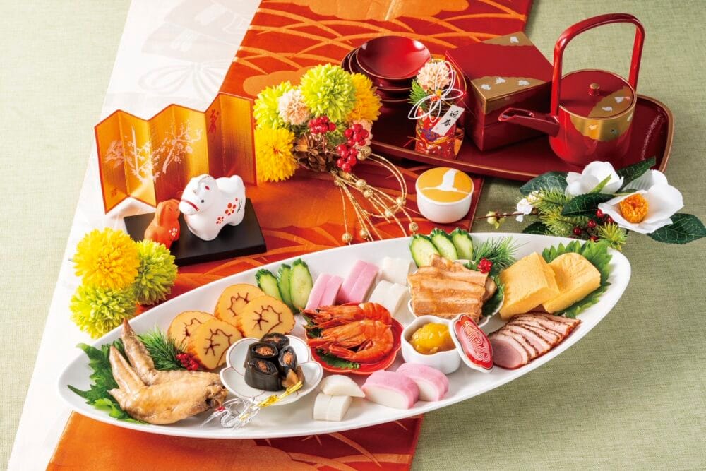 今年は、より多様化したニーズに応えるため、「伊達巻」や「⿊⾖」といった定番の和⾷に加え、「あい鴨スライス」や「北海道産豚のテリーヌ」といったお⾁を使った⼈気の洋⾷、⽇本に四川料理を広めたと⾔われる“陳建⺠”の秘伝のタレを使った「海⽼のチリソース煮」、「⿊酢酢豚」などの本格中華のおせちを発売し、全43品を販売します。