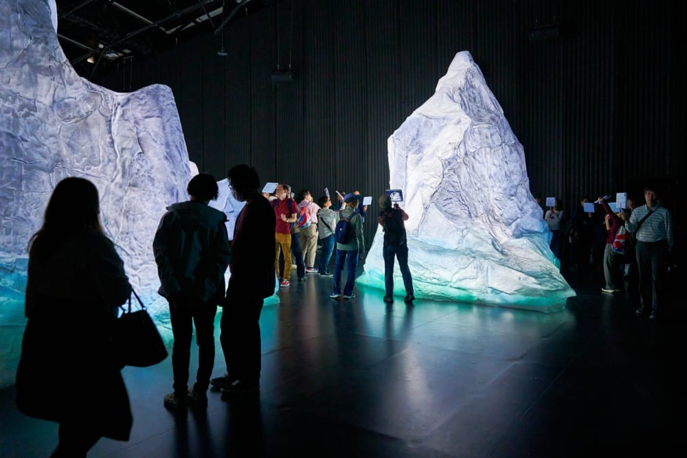 パビリオン内部は、氷河から水、そして芽吹きへと移り変わる自然のサイクルをたどる構成されており、来場者は 歩くだけでカナダらしい価値観や風景観が体験できるつくり。この空間構成には、先住民文化の自然観やカナダ特有の環境教育に基づくストーリーが反映されていて、来場者は過去と現在が境目なく融合された、時空を超えた体験により“循環”を身体的に理解できるよう意図されていたと考えられます。