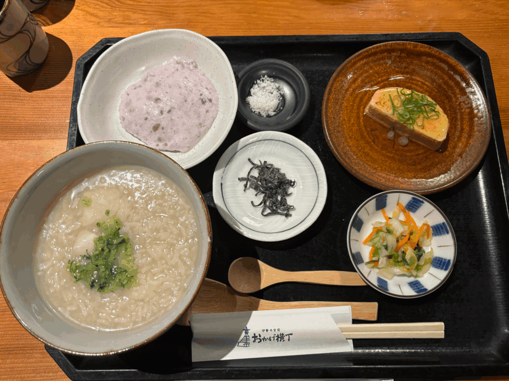 今回のツアー最大のハイライトは、まだ薄暗い早朝4時の「おかげ横丁」にあります。多くの人々が新しい月の平穏を祈願するため、この時間から活気が満ち溢れていました。早朝の寒さで冷えた体を温めてくれるのが、「とうふや」で提供される早朝限定の「朔日粥」です。