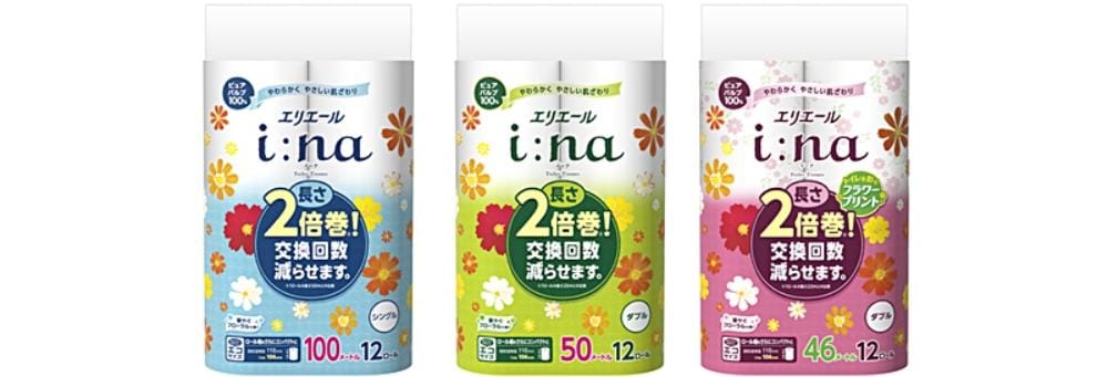 実際、「エリエールi:na(イーナ)トイレットティシュー 2倍巻12Rダブル」では、通常商品(「エルフォーレ」)と比較してCO2排出量を約33%削減しています※。