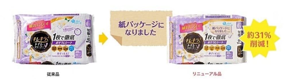 エリエールの取り組みはあえて「紙素材」への転換に挑みました。トイレ掃除用シート「キレキラ!トイレクリーナー 1枚で徹底おそうじシート」が1つの例として挙げられます。