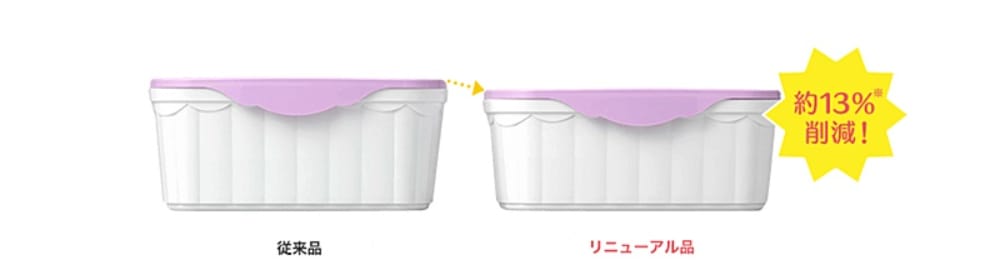 2022年に行ったリニューアルにより、本体容器を改善。内容量と密閉性はそのままに高さと厚みを減らし、全体のプラスチック量を従来品比で約13%※ 削減することに成功しました。また、パッケージのデザインに使用するインキも、環境にやさしい植物由来のバイオマスインキに変更しています。