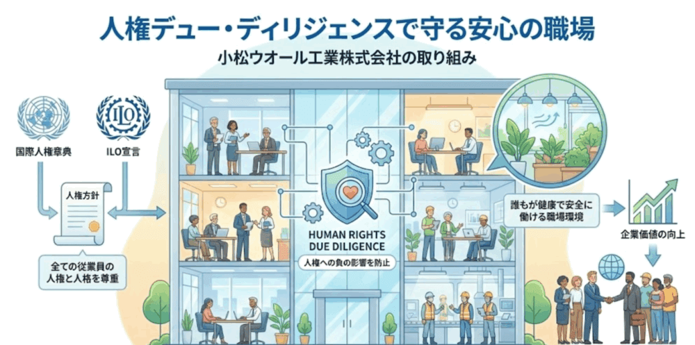 小松ウオール工業は、国連「国際人権章典」やILO「労働における基本的原則及び権利に関するILO宣言」などの国際規範を支持・尊重し、「人権方針」を定めています。全ての従業員の人権と人格を尊重し、事業活動が人権への負の影響を及ぼさないよう努める姿勢は、企業の社会への責任を果たす上で不可欠です。