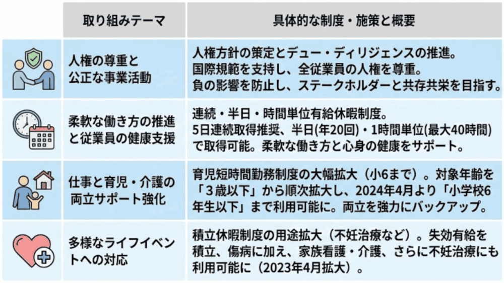 「働きやすい企業風土の実現」を目指し、同社は従業員のワークライフバランスを向上させるための柔軟な制度を拡充しています。