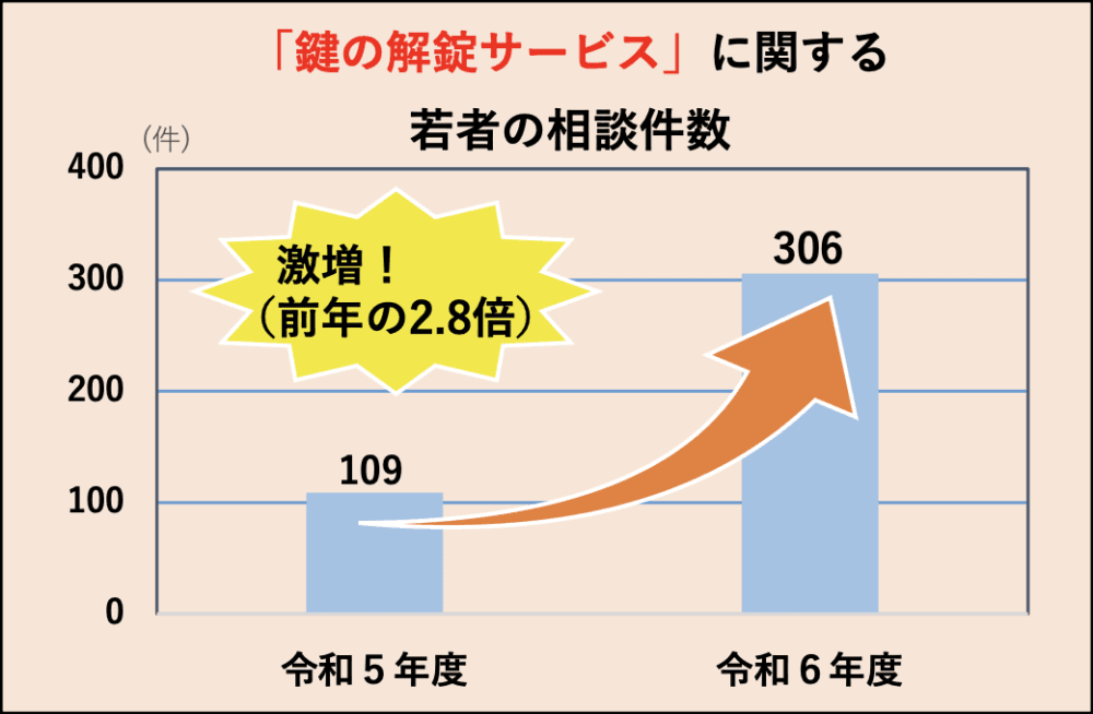 また、「鍵の解錠サービス」や「害虫駆除」などのレスキュー商法も増加しています。 「鍵をなくして家に入れない」「部屋に虫が出た」といった緊急時に、慌ててネット検索を行い、検索結果の上位に表示された「980円〜」といった格安料金の業者に依頼したところ、来訪後に「特殊な作業が必要」などと言われ、最終的に数万円から十万円単位の高額請求を受けるケースもあります。 特に鍵の解錠サービスに関する若者からの相談件数は、令和5年度の109件から令和6年度の306件へと約2.8倍に激増しています。
