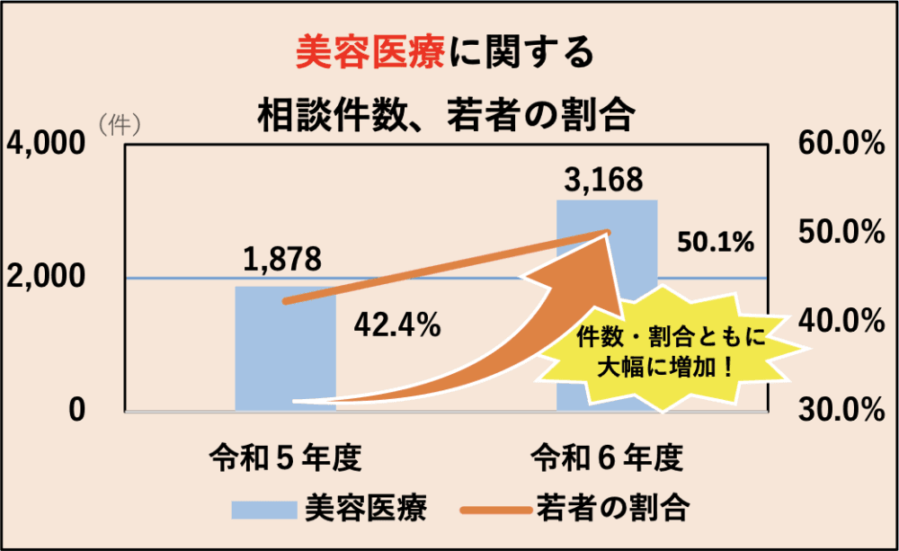 特筆すべきは「美容医療」に関する相談の急増です。 令和5年度の相談件数は1,878件でしたが、令和6年度には3,168件へと大幅に増加しました。さらにこのうち29歳以下の若者が占める割合が50.1%に達しています。美容医療トラブルの実に半数が、若者によって占められているという事実があります。