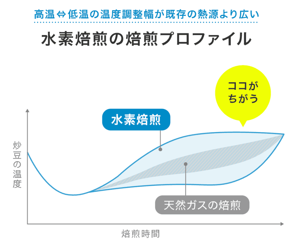 「環境に優しいだけではなく、“味が良くなる”ことが絶対条件でした」と里見さんは言います。水素は弱火から強火まで細かく制御でき、従来のガス焙煎では描けなかった焙煎プロファイルを実現できます。