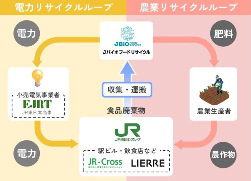 食品廃棄物から生まれる循環を、街の中で実感できる本フェアの背景にあるのは、JR東日本グループが推進する『ダブルリサイクルループ』の取り組みです。『ダブルリサイクルループ』とは、駅ビルやエキナカ施設などから排出される食品廃棄物を、廃棄物として処理するのではなく、「電力」と「農業」の二つの分野で再生利用する仕組みです。