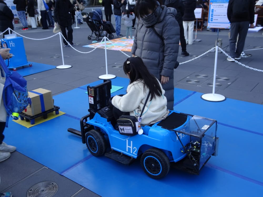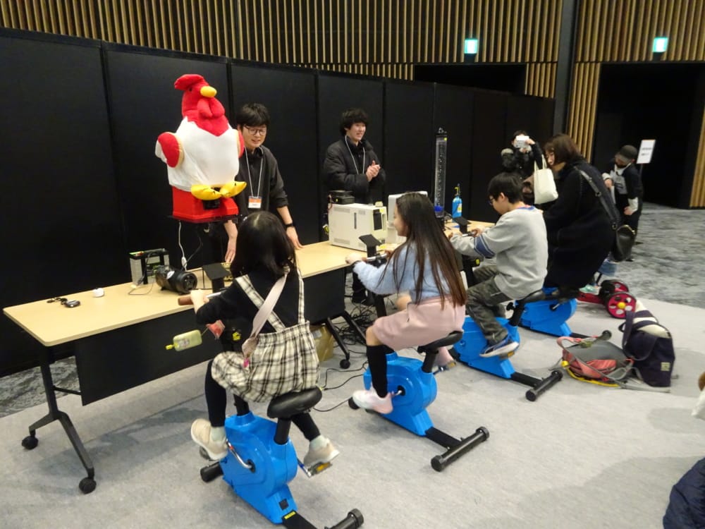 子ども向けには、水素で動く電車やミニショベルカー、ミニフォークリフトの体験エリアも用意されていました。体験するためには、乗り物を動かすための水素を足漕ぎの装置で作らなければなりません。子どもたちは親御さんと一緒にはしゃぎながら水素を作っていました。