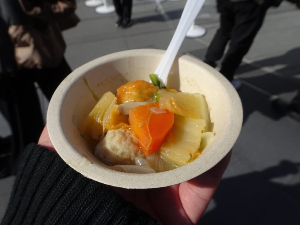 水素の可能性の中でも驚かされたのは「水素調理」です。水素を燃焼させると水蒸気、つまり水が発生します。そのため、水素調理は食材の水分を保ったままジューシーに焼き上げることができるそう。スタンプラリーの特典として提供された「東京しゃも」の食べ比べでは、香ばしさと共存するしっとりとした食感を体験することができました。ともに振る舞われた「ちゃんこ鍋」も、東京産の食材が使われており、野菜の旨みが凝縮された深い味わいでした。