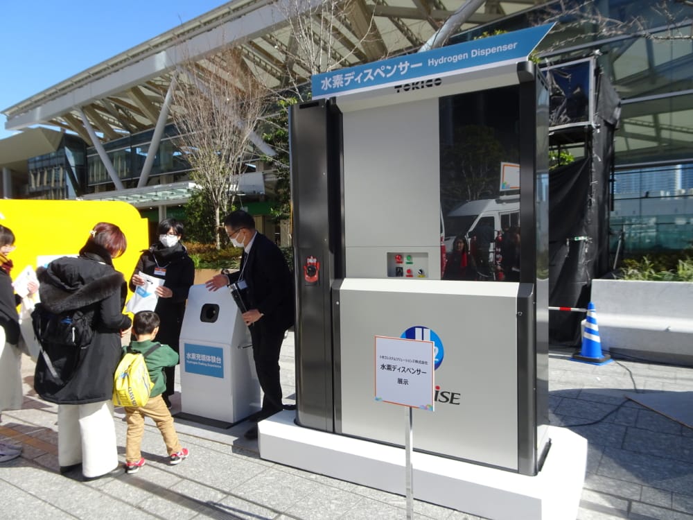 水素を供給するディスペンサーの体験展示(国内メーカー2社(タツノやトキコシステムソリューションズ)のディスペンサーが展示された)