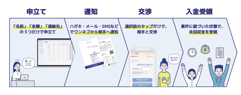 「ワンネゴ」は、BtoBにおける少額債権の未払いという課題に対し、オンライン上で債務者による支払いを完結できるプラットフォームです。事業者が、対象者の名前、連絡先、未払いの金額を入力すると、「ワンネゴ」から申立て通知が送られます。通知を受け取った債務者は、QRコードから即時払い、分割払いなど支払い方法を選択し、その場で支払いを完了することができます。