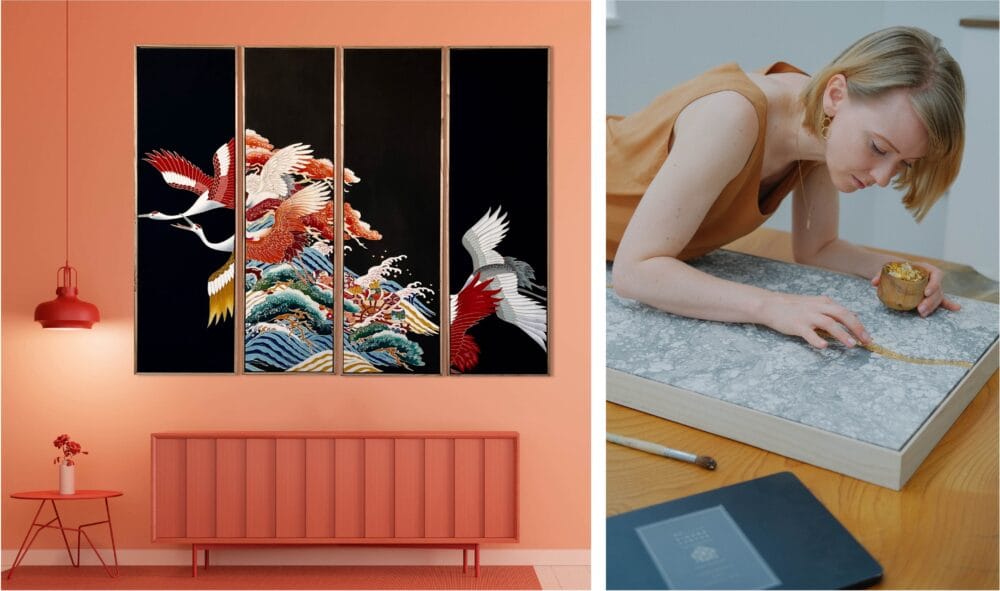 「ikasu」の作品は、一点一点が持つ歴史や織りの記憶を尊重しながら、現代の居住空間に調和する「テキスタイルアート」として再構築されているのが特徴です。また、着物や帯の生地そのものだけでなく、アンティークの桐たんすを額材に用いるなど、素材を余すことなく活かしきる「オールアップサイクル」を追求しています。素材本来の美しさを活かしつつ生まれ変わった作品は、洗練された現代の空間に映える唯一無二の存在感を放ちます。