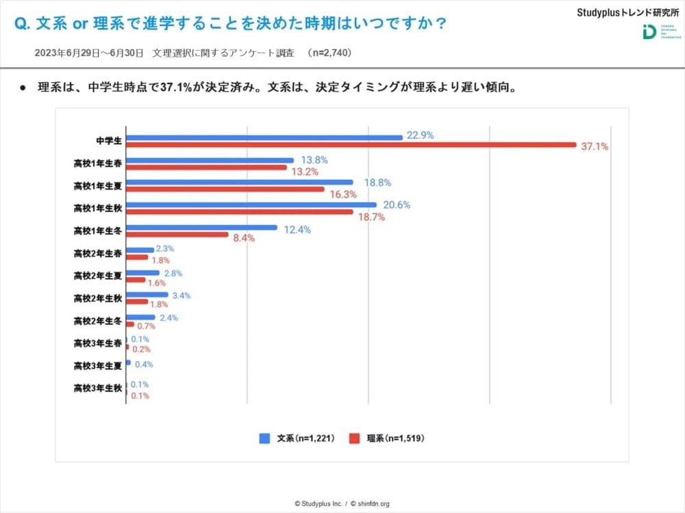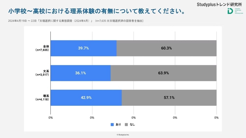 実際、『R6 Studyplusトレンド研究所調査』の結果が示すところによると、理系を選択する学生は、小学校から高校までの間に理系体験を多く経験している傾向があるそうです。また、文理選択をした時期を見ると、約4割が中学生の段階で方向性を決めているのだとか。したがって、早い段階で理系体験に触れることで将来の選択肢が広がる可能性があります。