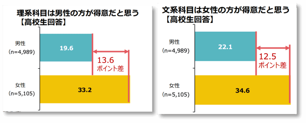 例えば東京都⽣活⽂化スポーツ局『令和5年度性別による無意識の思い込み実態調査』によると、男性よりも女性の⽅が教科に対する“無意識の思い込み”を持つ人の割合が⾼いという結果が出ています。しかも、成長とともにその思い込みを持つ人が多くなる傾向にあるのだとか。