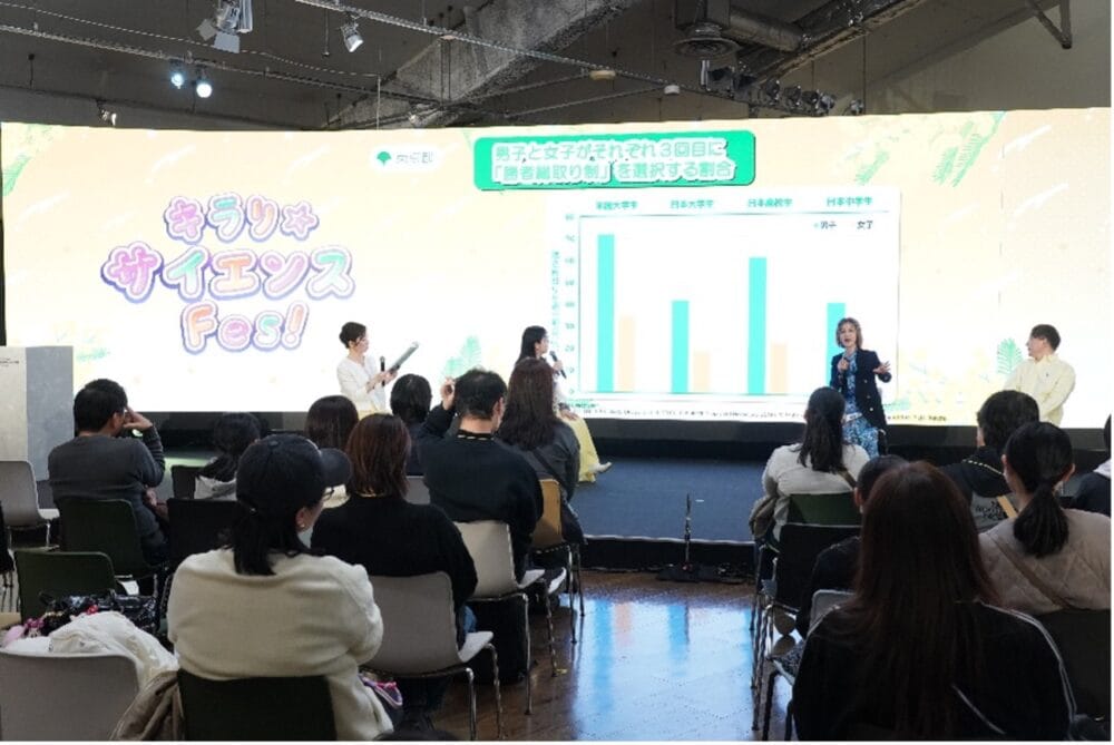 それに加え、子どもの進路相談に乗ることも多い保護者側のアップデートも必要不可欠でしょう。東京都⼦供政策連携室『令和7年度 第1回SNSを活⽤したアンケート結果』では、子どもが相談をした時に、「男だから」「女だから」という視点で進路選択に意見を寄せたことがある保護者が一定数存在していることが分かりました。保護者も性別に関する「無意識の思い込み」に気づくことが必要──そのような背景も相まって、今回のイベント「キラリ☆サイエンスFes!」は、子ども・保護者どちらも参加できる形式で行われました。