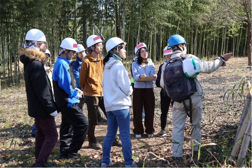 続いて竹林へ向かう道中には、イノシシから栗林を守るための電気柵も設置されており、野生動物との共生という現代の里山が抱えるリアルな課題も、学生たちは目の当たりにしました。