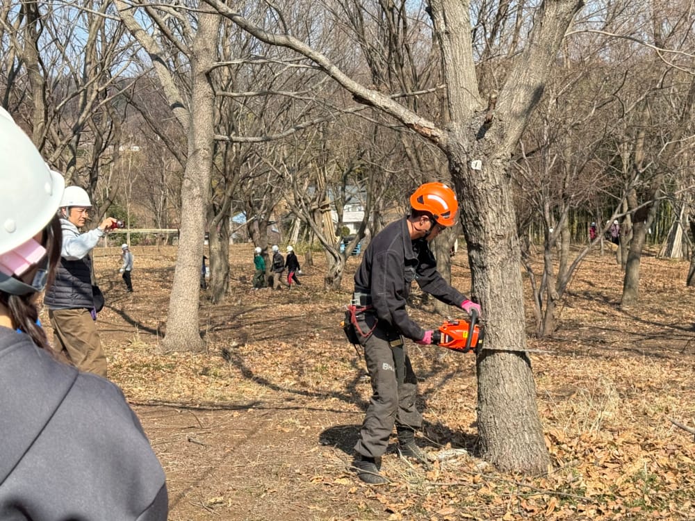 後半はいよいよ、樹木の伐採体験です。里山の循環サイクルを取り戻すため、あえて木を切り、新しい芽吹きを促す重要な作業です。