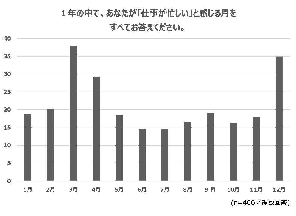 また、1年の中で『仕事が忙しい』と感じる⽉として上位に挙げられたのは「3⽉(38.0pt)」「12⽉(35.0pt)」「4⽉(29.3pt)」。「仕事が忙しい⽉として選んだ⽉は、他の⽉と⽐べて仕事とプライベートのオン・オフの切り替えについてどう感じますか?」という問いには、「忙しい⽉では他の⽉よりも、オン・オフの切り替えが難しいと感じる」と回答した⼈が 24.6%、「やや切り替えが難しいと感じる」と回答した⼈が 31.9%と、半数以上の⼈が通常時よりもオンオフの切り替えが困難であると感じていることがわかりました。