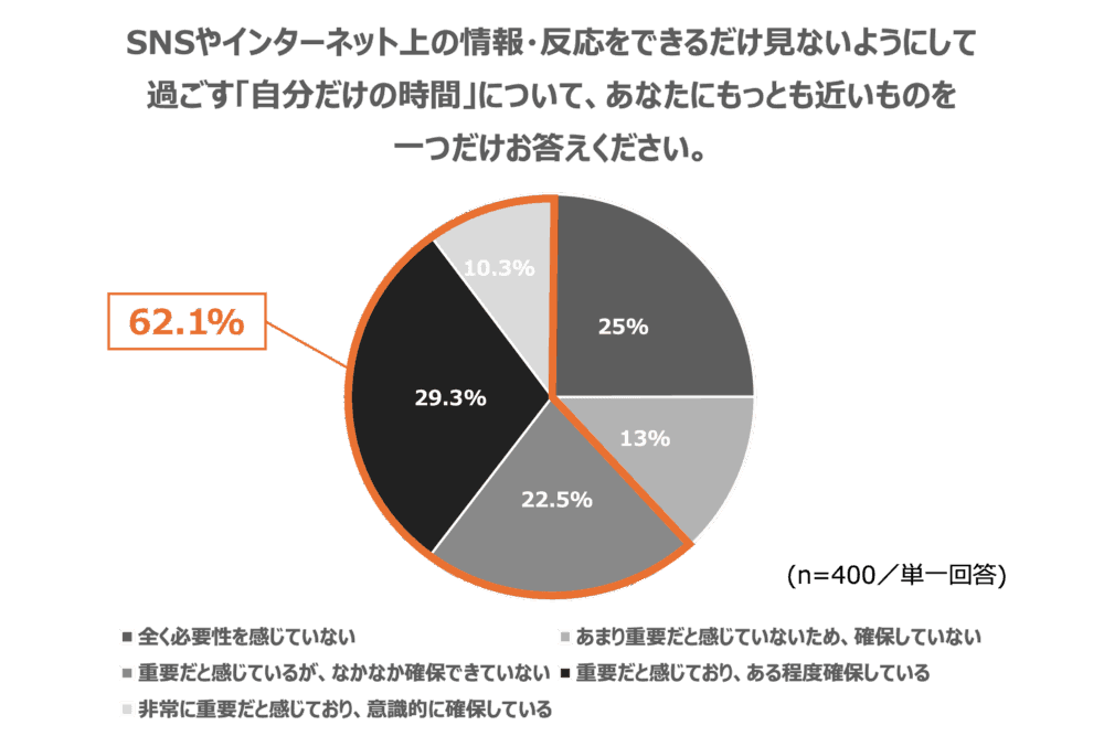 「SNS やインターネット上の情報・反応をできるだけ⾒ないようにして過ごす『⾃分だけの時間』の重要性」について尋ねた設問では、約62%の⼈が「重要である」と回答。常にデジタルデバイスに接することができる環境下において、ネット上の情報に意識を向けるのではなく、⾃分⾃⾝の楽しみや思考を尊重する「⾃分だけの時間」は、現代⼈にとって価値ある時間として認識されていることがうかがえます。