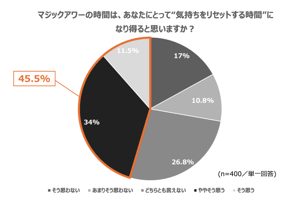 同じ調査で、対象者に「マジックアワー」という⾔葉の認知度を調査したところ、「知らない」と回答した⼈は 53.3%と過半数を占めました。⼀⽅で「マジックアワーの時間は、⾃⾝にとって“気持ちをリセットする時間”になり得ると思いますか︖」という問いに対しては、45.5%のおよそ半数の⼈が「そう思う」または「ややそう思う」と回答し、マジックアワーの時間帯に「気持ちのリセット効果」を感じていることが明らかに。このことから、⾔葉の認知度に左右されることなく、マジックアワーには本能的な癒やし効果が存在すると考えられます。