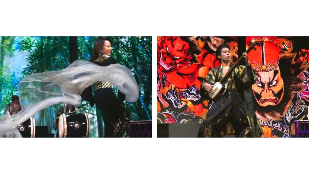公開された15分間のパフォーマンスでは、和太鼓のみならず、篠笛や三味線、箏といった多彩な日本の伝統楽器が組み合わされていました。体の内側にまで響くような太鼓の音とともに、巨大なビジョンには迫力ある映像が映し出されます。そこにコシノジュンコ氏が手がけた重厚な衣装が加わり、視覚的にも非常に密度の高いステージとなっていました。激しい動きと、ふとした瞬間に訪れる静寂。その対比が非常に美しく、息をのむような没入感のあるパフォーマンスが披露されました。