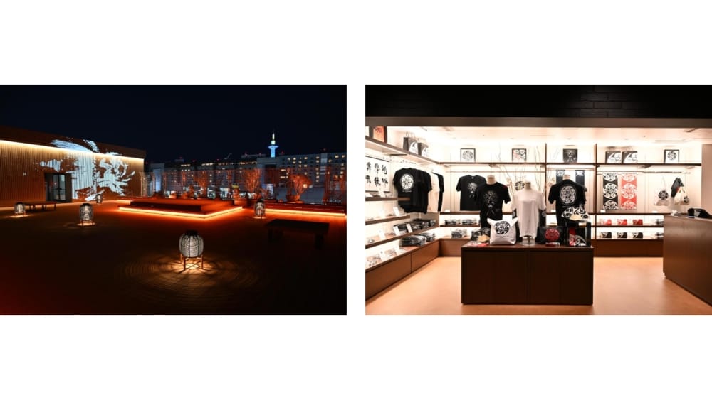 劇場併設のルーフトップでは、ラウンジで購入したフードやドリンクを持ち込んでくつろぐことができます。ルーフトップからは京都タワーを臨むことができ、夜風にあたりながらくつろぎの時間を過ごすことができます。このほかギフトショップでは、公演オリジナルグッズのほか京都ならではの特産品とコラボレーションした商品も展開される予定となっています。