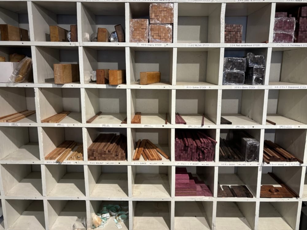 体験の第一歩は、「箸の顔」とも言える木材選びから。用意されているのは、古来より日本の建築や生活用品を支えてきたヒノキやサクラをはじめとした著名な木材から、パープルハートやスネークウッドといった目新しい木材まで、どれも厳選された天然木ばかりです。